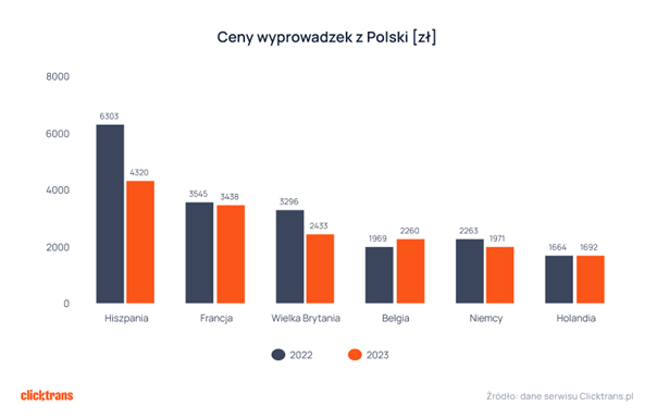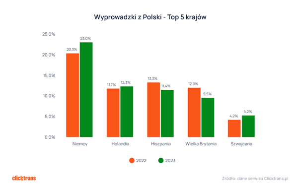 Ósma edycja Raportu Przeprowadzki 2023 oparta jest na ponad 57 tys. zleceń przeprowadzkowych opublikowanych w Clicktrans w latach 2011-2023. W 2023 roku najchętniej wybieranym kierunkiem wyprowadzki były Niemcy, Holandia i Hiszpania. Po raz pierwszy poza pierwszą trójką najchętniej wybieranych krajów znalazła się Wielka Brytania, która do 2020 roku była głównym kierunkiem wyprowadzek z Polski.